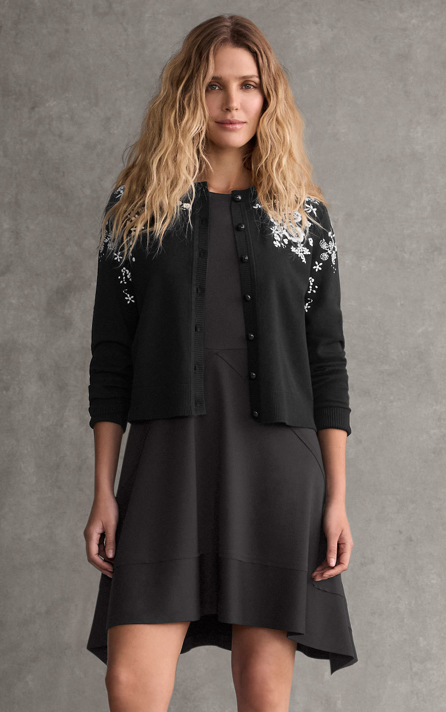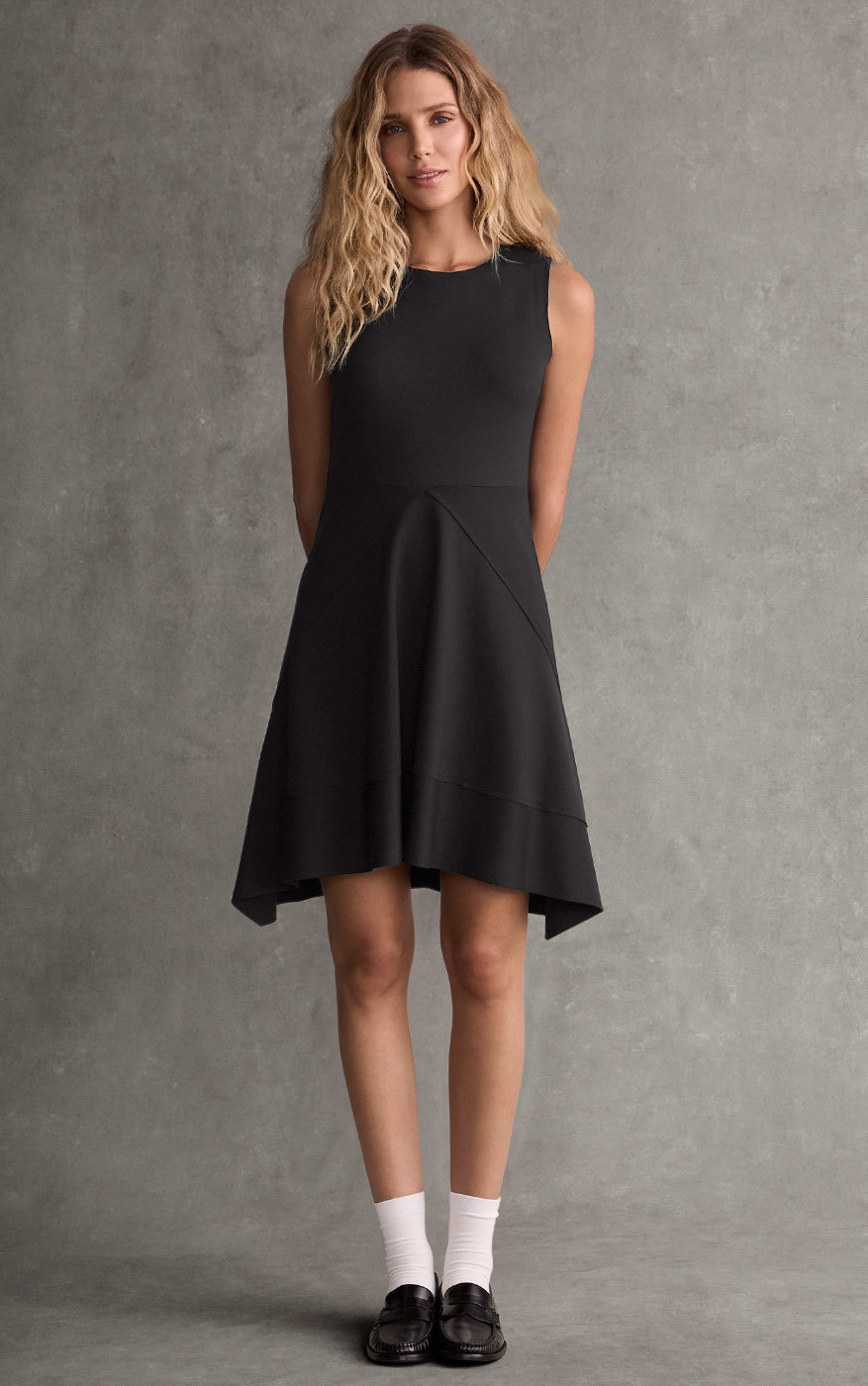 Your go-to little black dress. Draped in a classic a-line fit and finished with raw-edge seams and asymmetrical lines, the Ashley Dress feels both architectural and effortless—ready to travel or take on the town.