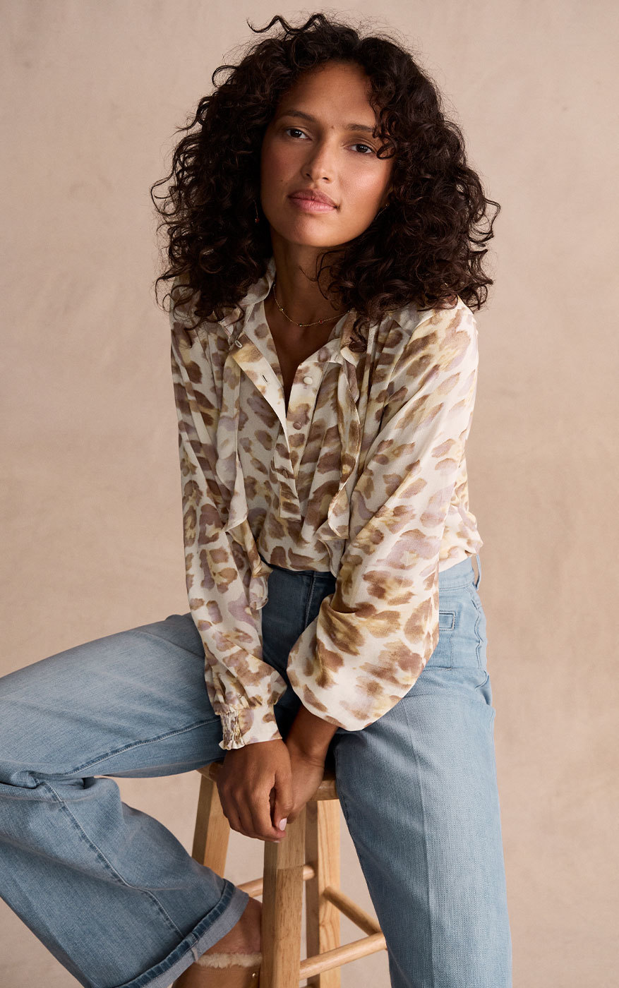 Designed in chiffon with an easy fit, the Ava Blouse highlights a ruffled neckline, tie detail, and self-covered buttons. Its romantic style makes it a perfect match for the Ines Skirt or polished under the Jones Jacket.