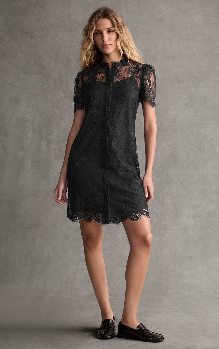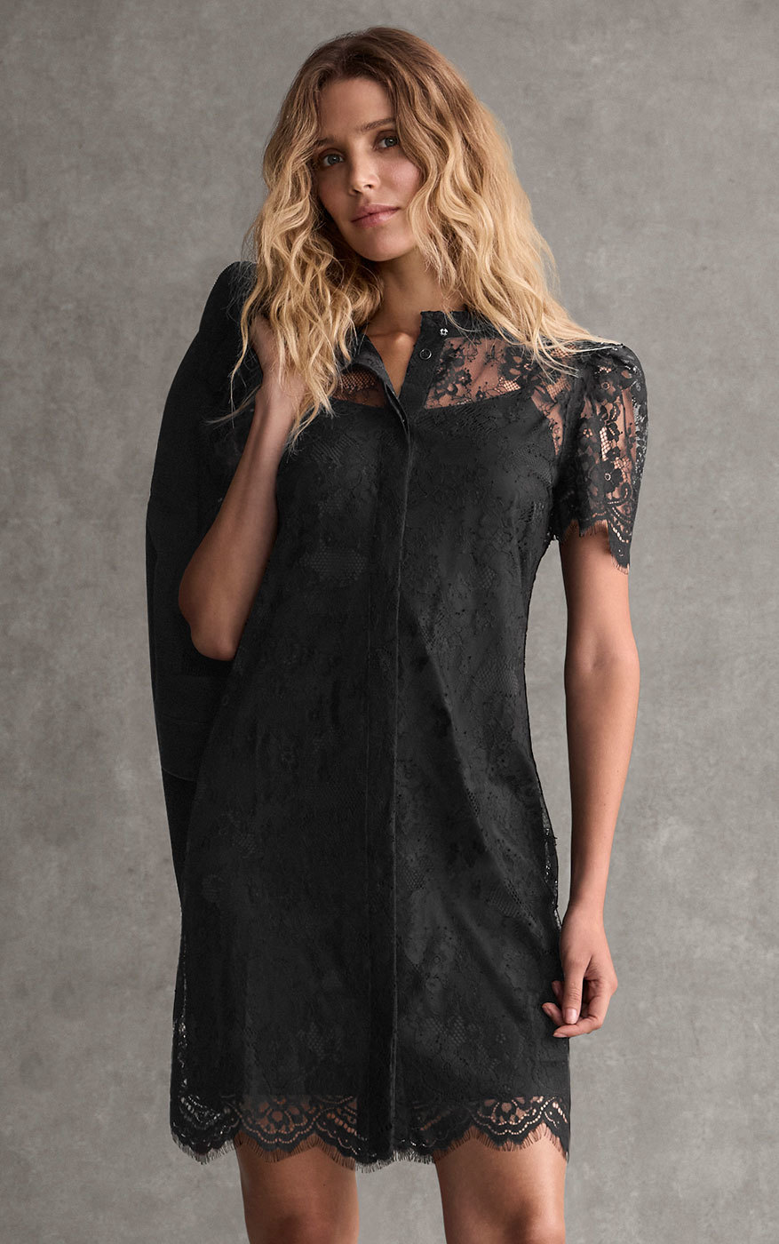 Romantic and refined, the Diva Dress pairs a delicate lace overlay with a satin-like slip beneath. Ruffle and scallop details add feminine charm, while the easy fit ensures comfort from dinner to dance floor.
