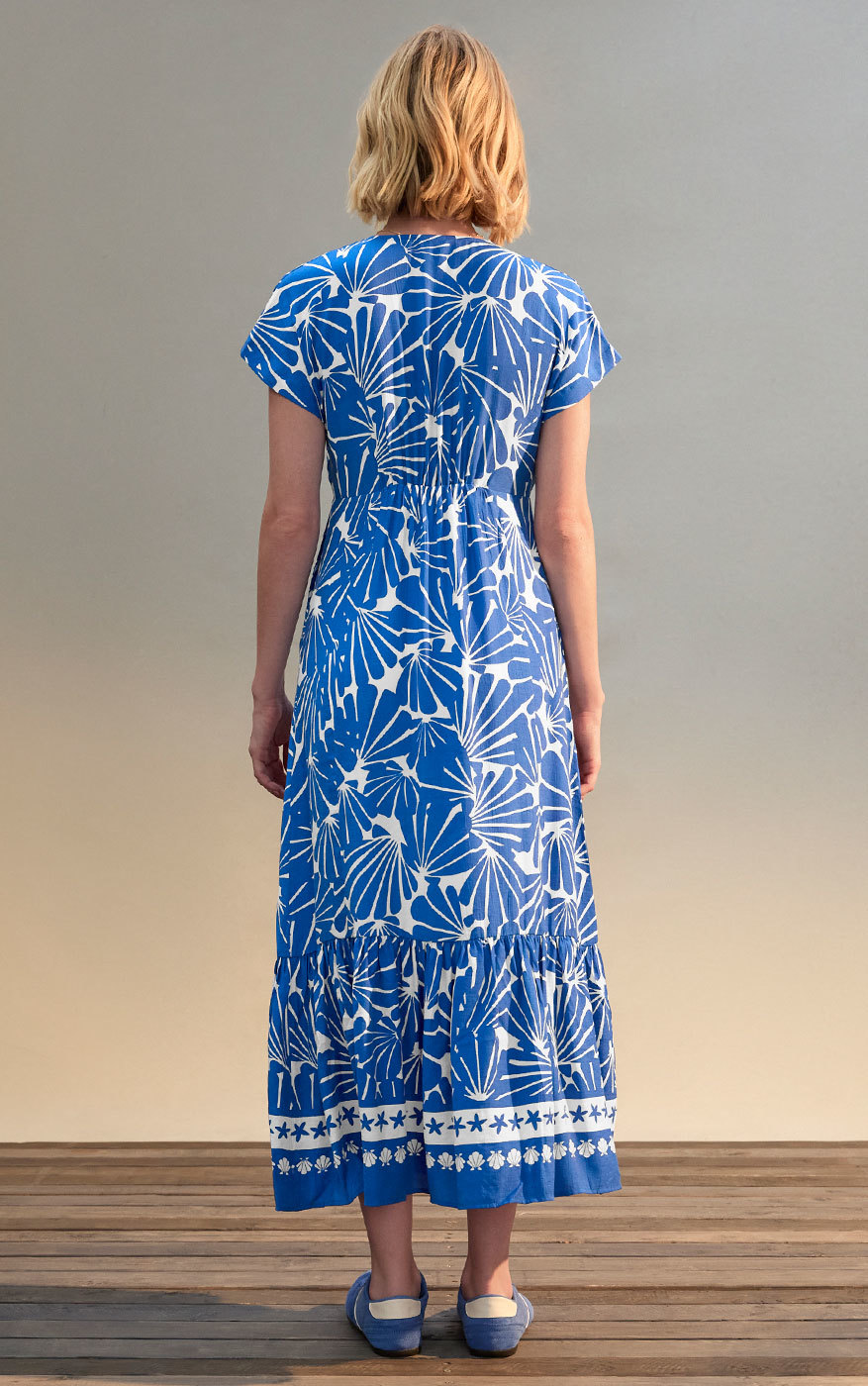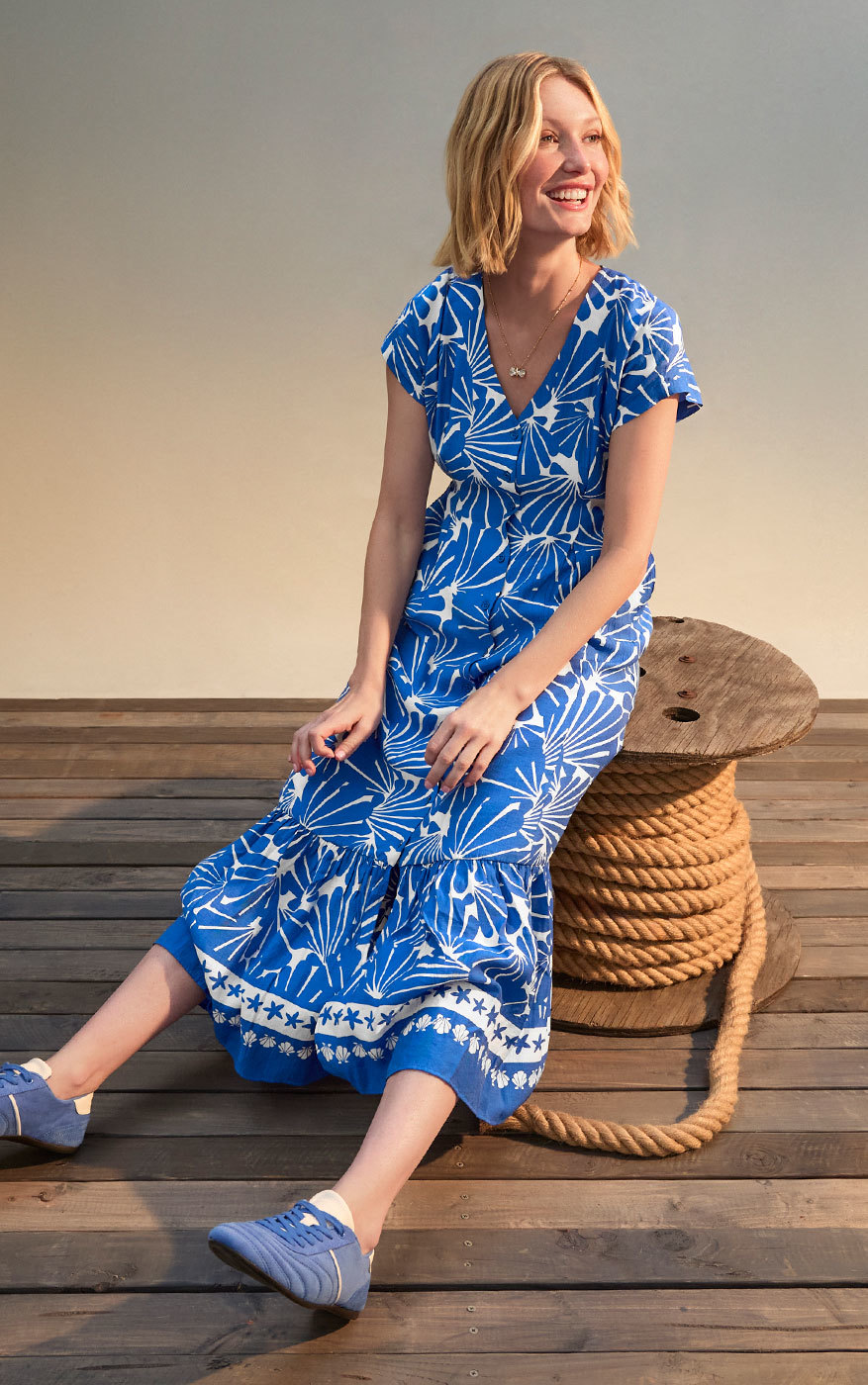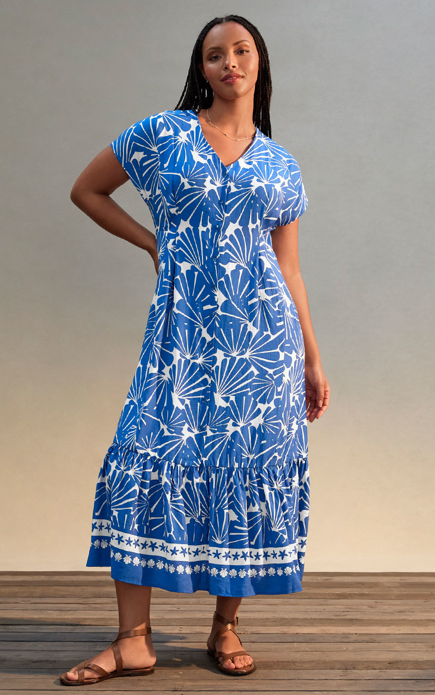 Make a splash in this bold shell-print maxi with nautical border hem. The Dune Dress has a V-neck and inverted pleat detailing at the waist to flatter every figure while back shirring and pockets keep it breezy and effortless. Perfect with either sandals or sneakers, it’s resort style made easy.