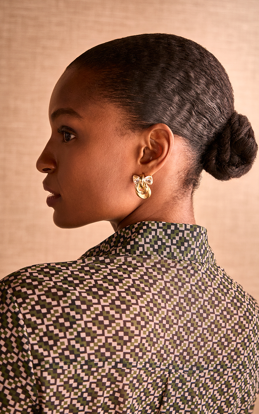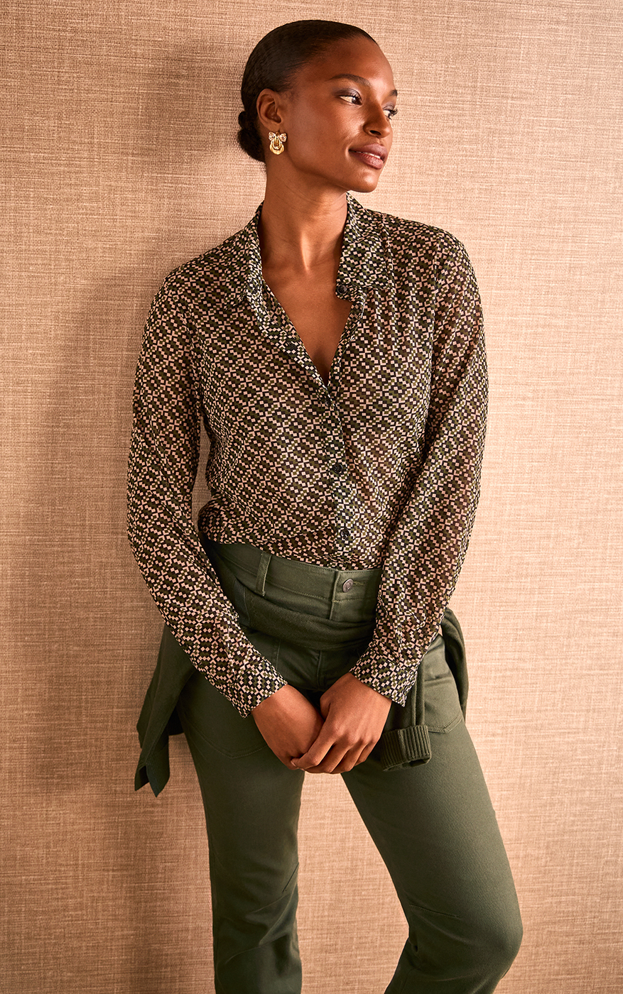 The Mesh Shirt's mosaic tile print in blush, olive, and dark chocolate adds instant interest under blazers for client calls or worn solo with wide-leg trousers for a night at the theater. Its lightweight fabric layers beautifully without adding bulk, so you can let your style stand out and still feel like yourself.