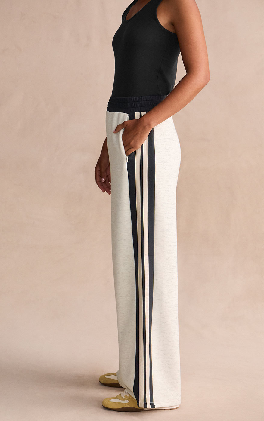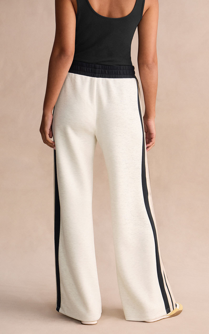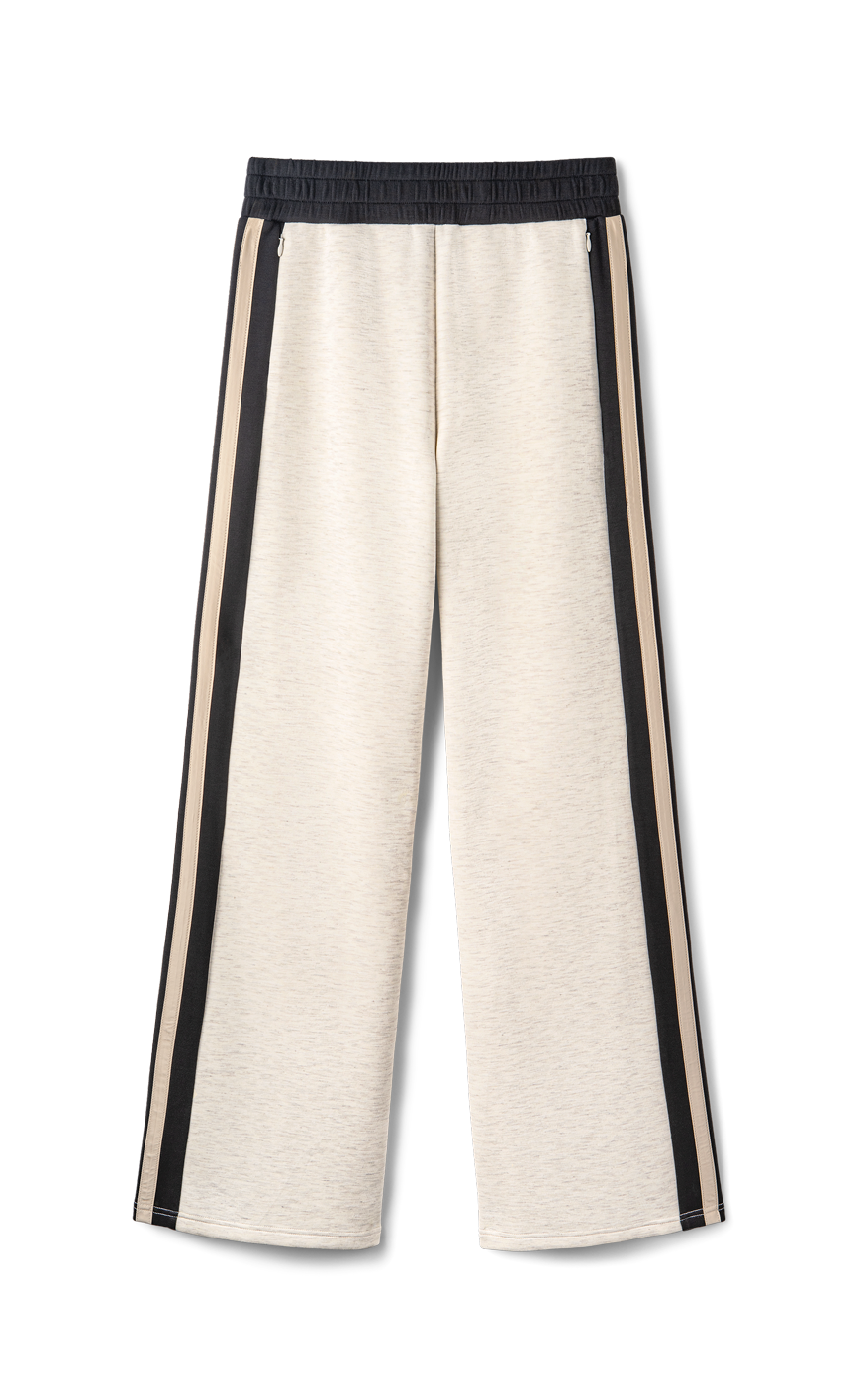 - Easy fit, high rise, elastic waistband, wide leg, contrast fabric satin stripes down side seams, front inset zip pockets