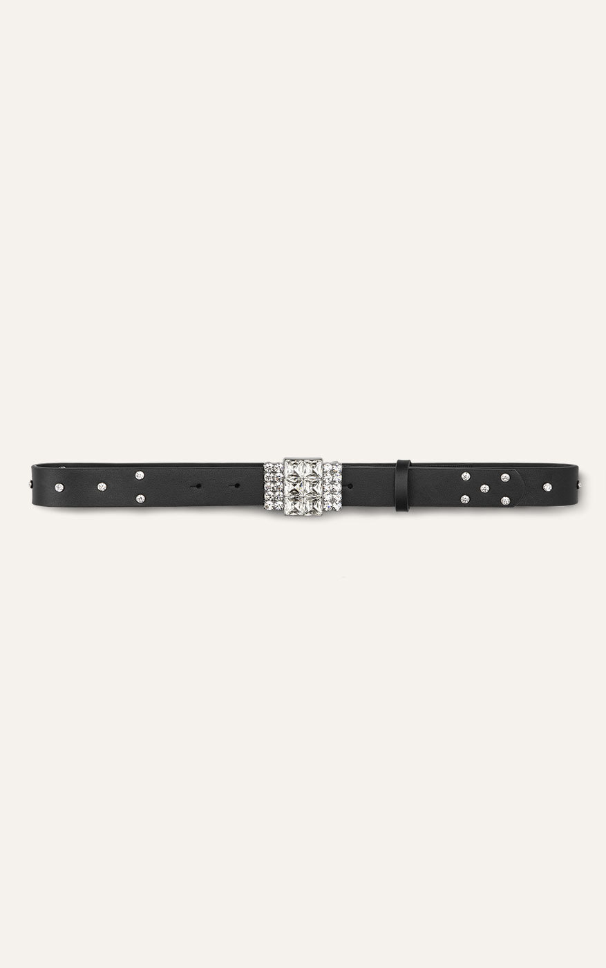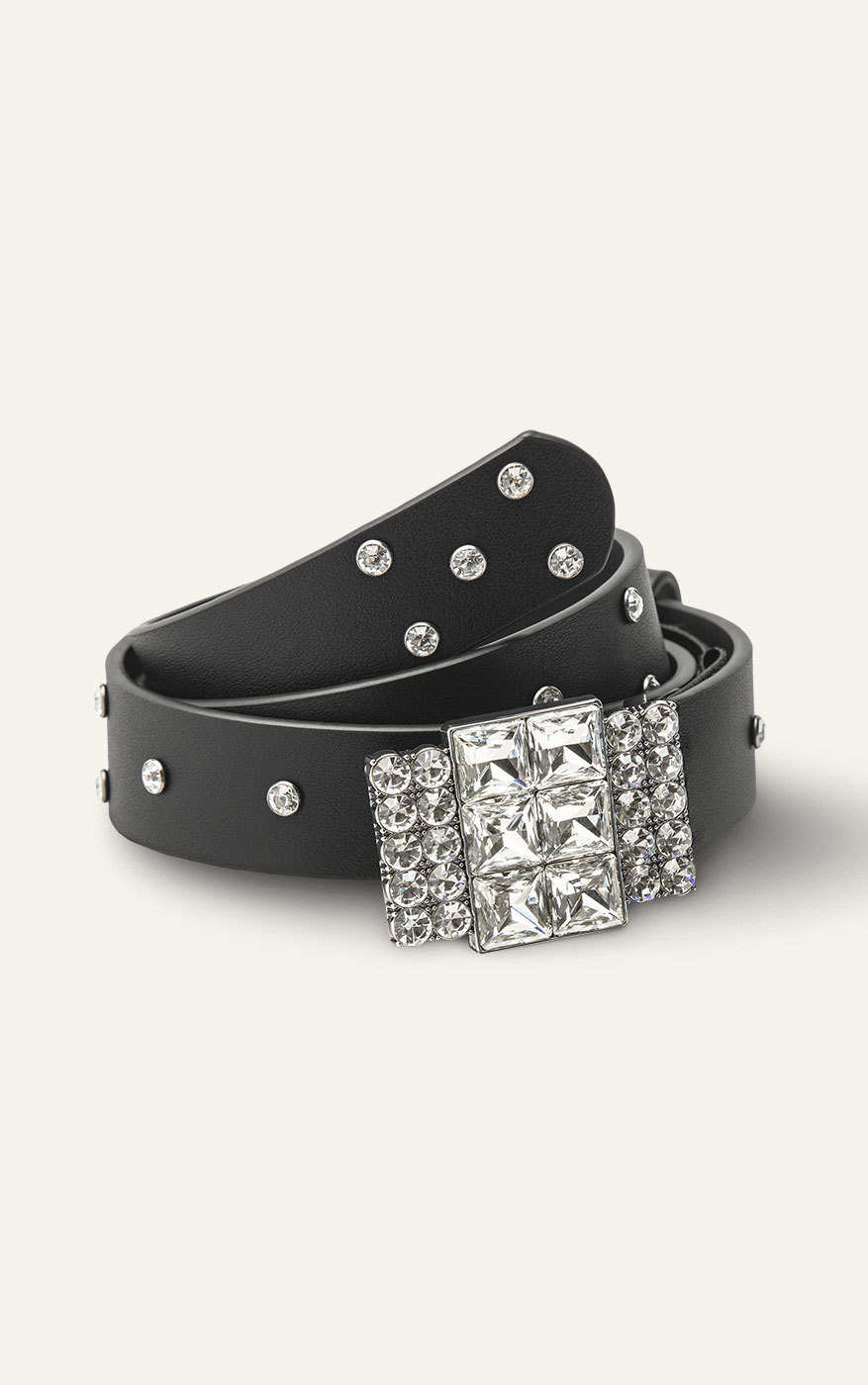 - Large square rhinestones at the center, smaller circular rhinestones on either side, tiny rhinestones around the rest of the belt