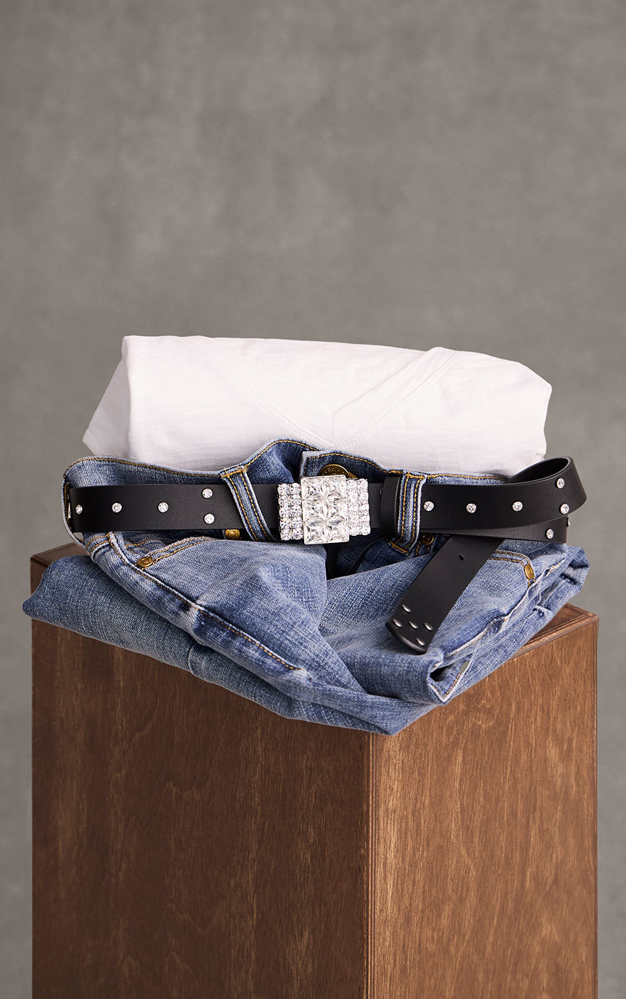 Rhinestones catch the light from every angle when wearing the Twinkle Belt. This slim leather beauty is your outfit's exclamation point—equally stunning with denim for everyday glamour or dressed-up holiday looks when you need that extra bit of shine.