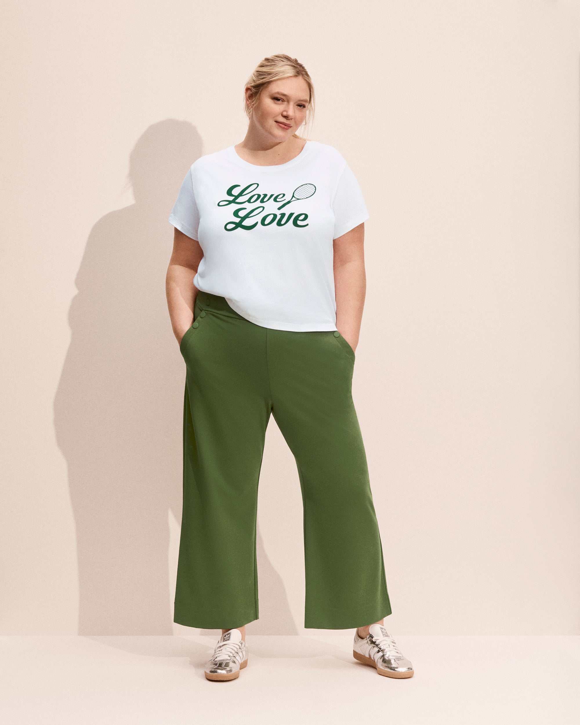 The Love All Tee offers the same easy silhouette as our Ciao Tee, updated with a new playful print that adds personality to any outfit. Crafted from a soft jersey knit, the love tennis t-shirt features a classic crew neckline, cap sleeves, and a straight hem for effortless wear. Coverstitch detailing along the seams and center back gives subtle structure and polish. Pair it with jeans to dress down a blazer for a cool, off-duty look.