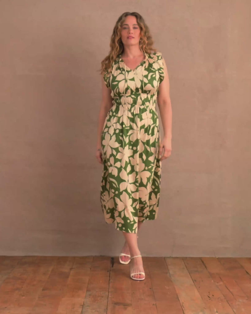 Your perfect getaway dress has arrived. The Havana Dress is ready for the beach in its allover tropical print. Where vacation vibes and vintage charm meet, this A-line dress has a ruffle tie-front neckline and elastic detail at the waist for an easy fit. Pair with the Snapshot Jacket to cover up on chillier nights.