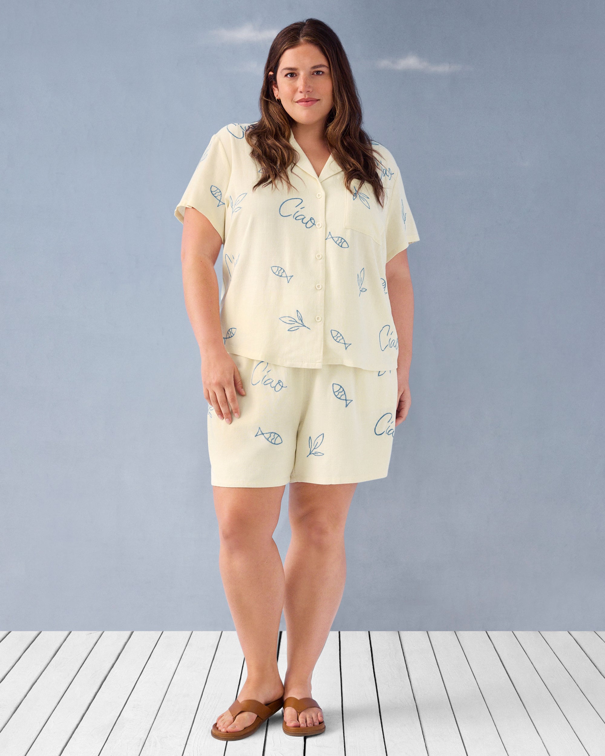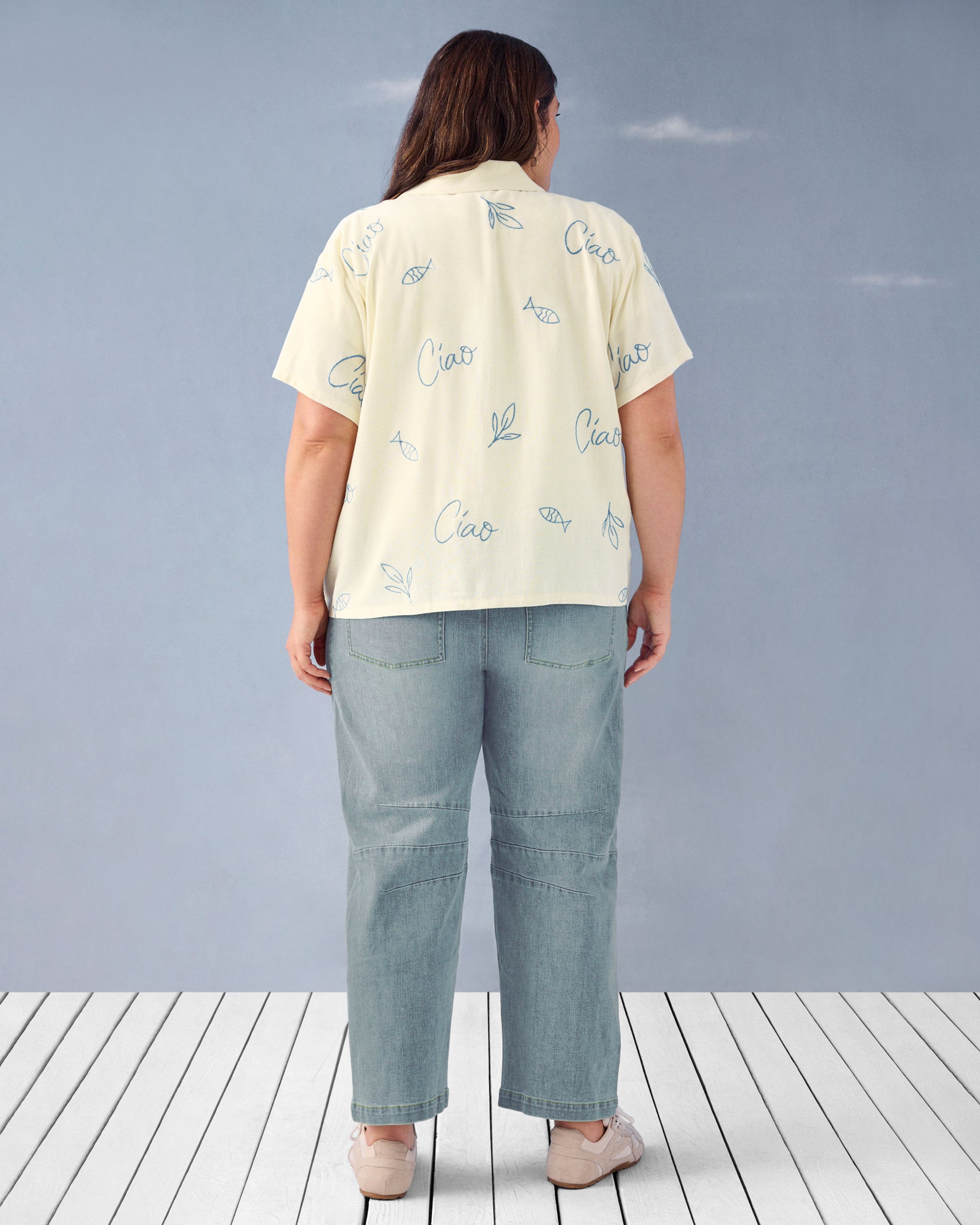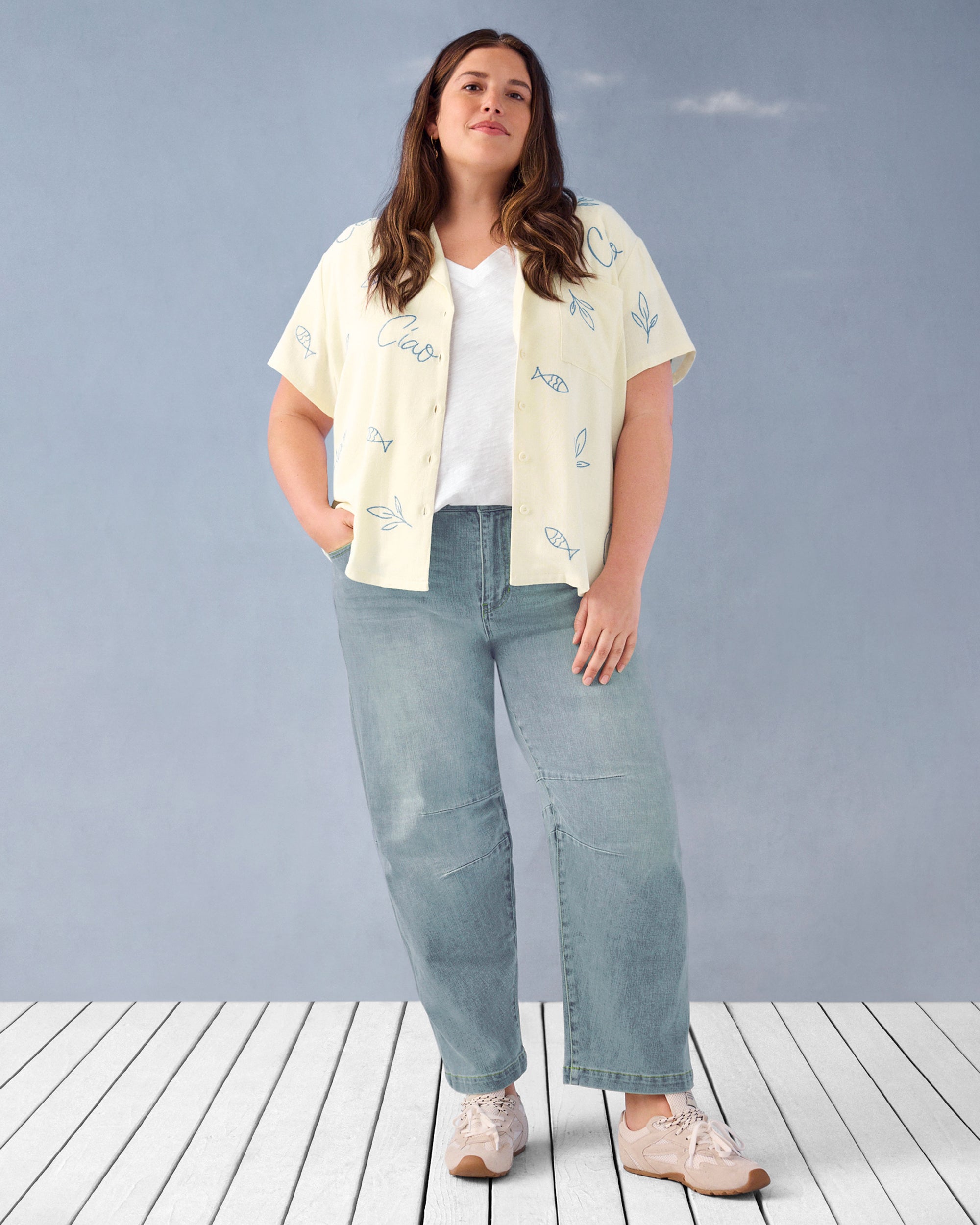 The Pier Top features intricate embroidery for a fun and whimsical way to play with your style. Designed with a notch collar and button front, this classic fit can be easily paired with the matching Pier Short or your favorite pair of denim.