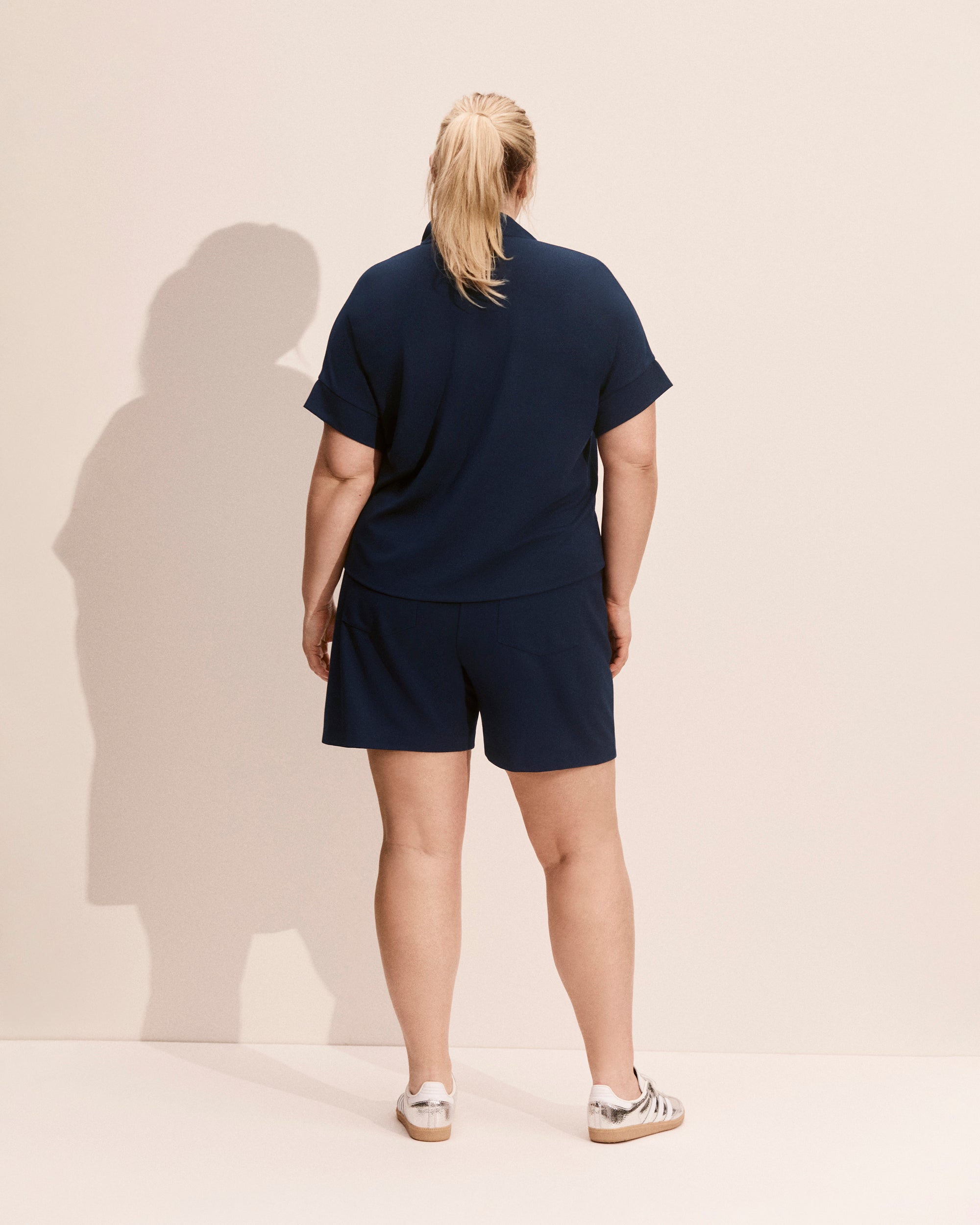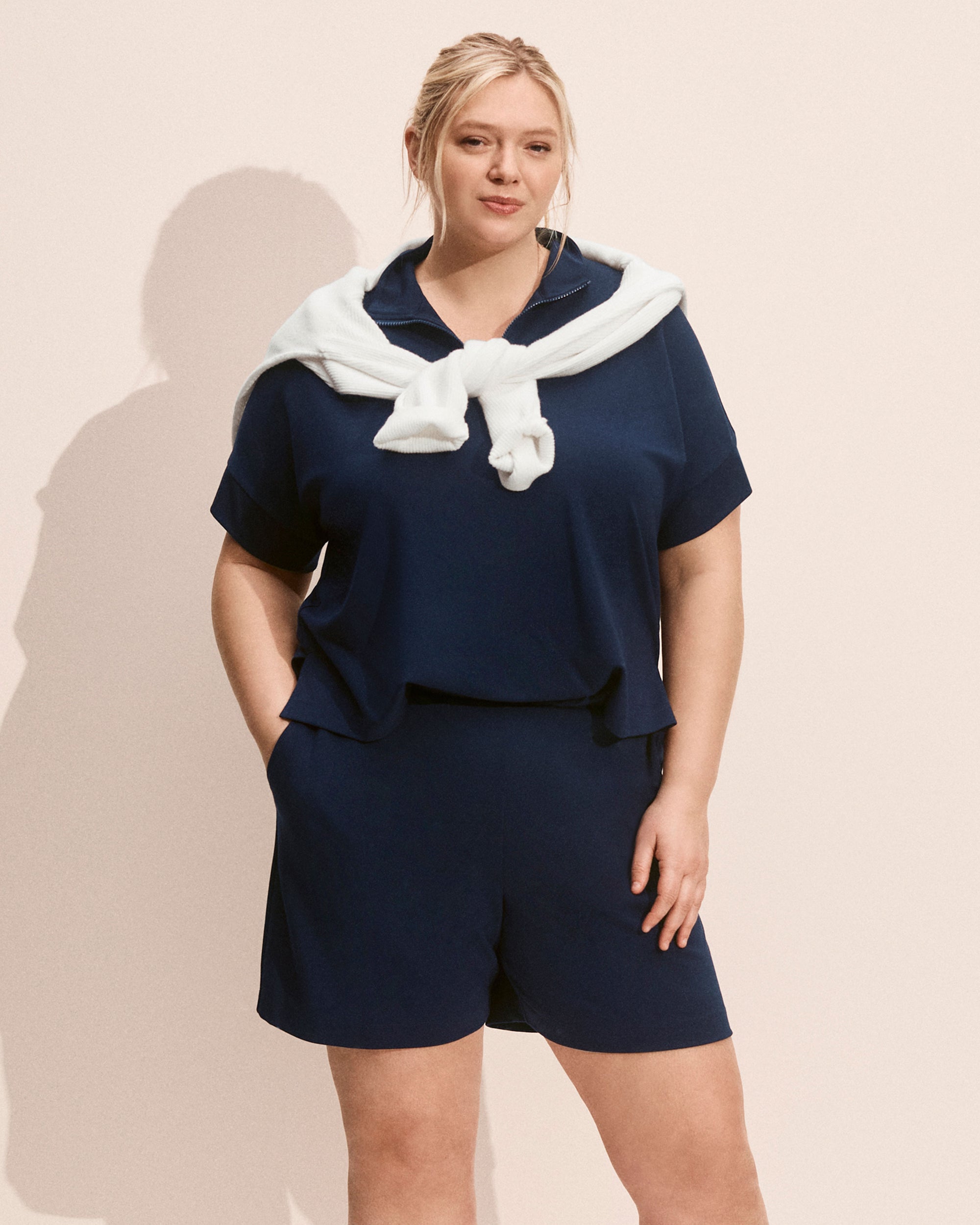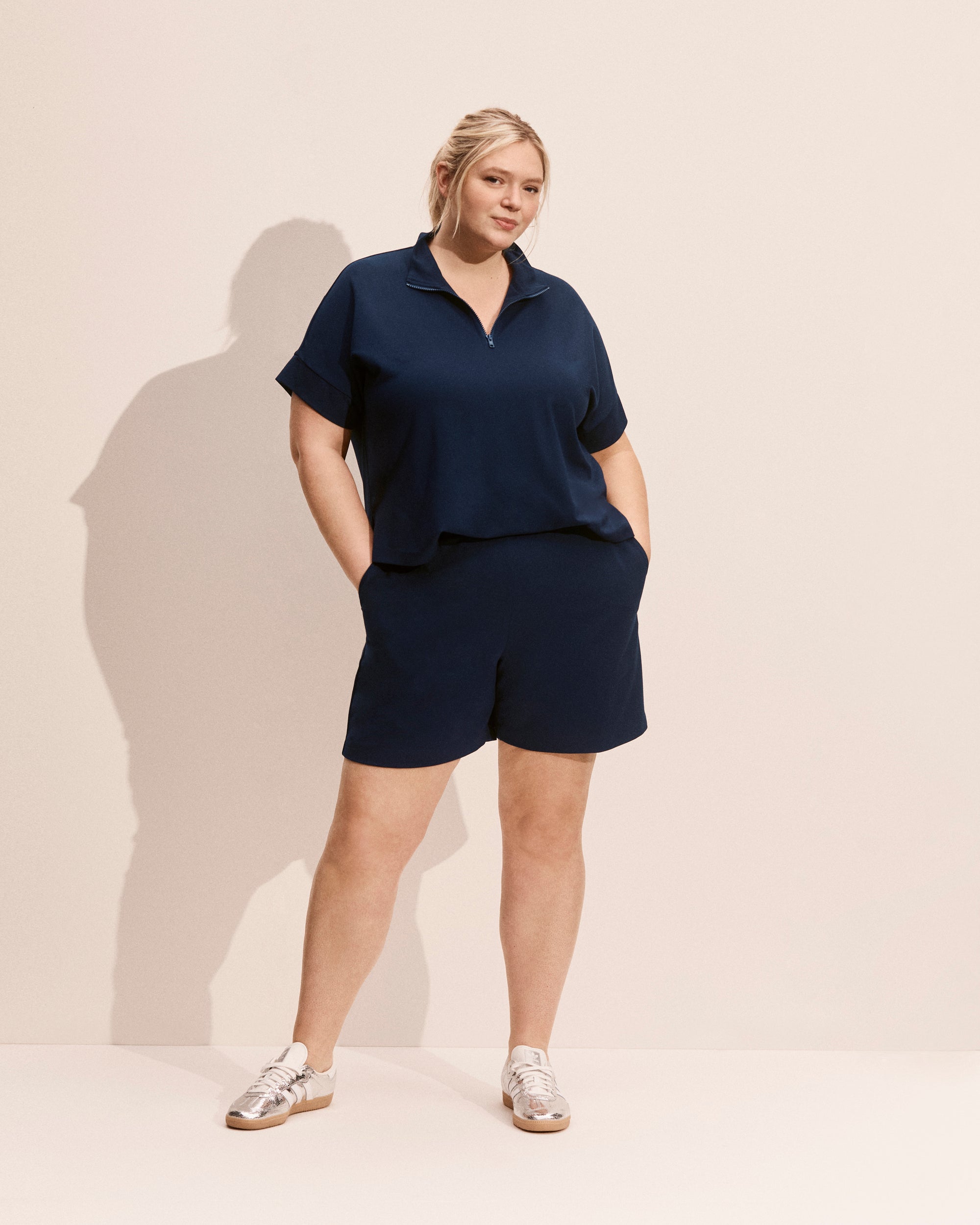 Crafted in an interlock knit, the Centerline Playsuit in classic navy offers effortless, relaxed style. The mock neck with zipper and banded cap sleeves create a sleek, modern silhouette, while the front bodice attached to the shorts and the back remains free for easy movement. Dress our navy blue romper up or keep it casual—this playsuit is ready for any occasion.