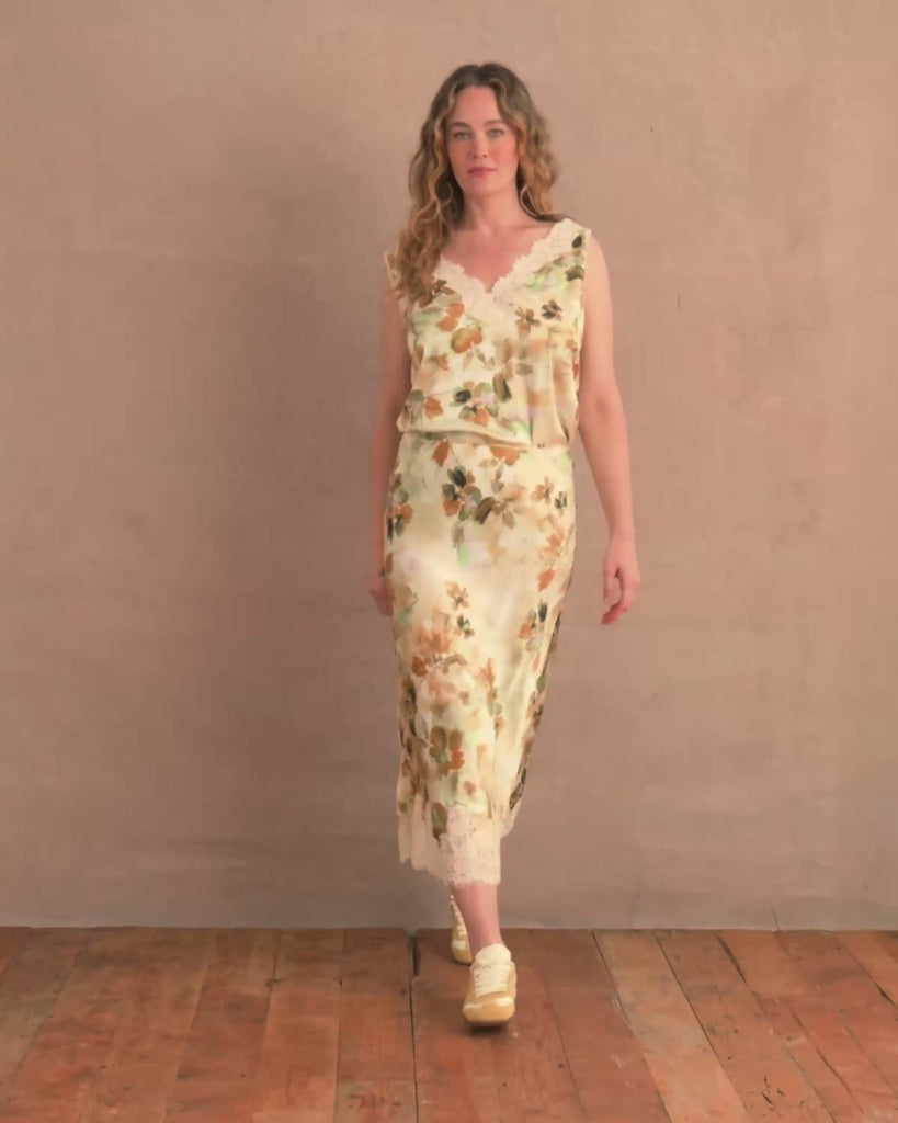 A touch of floral whimsy is just what you need to add to your rotation. The Misty Top features a mix of a satin watercolor print and soft lace at the neck and arm for something truly unique. Pair with the matching Misty Skirt for a chic set, or use this top as a base under blazers and cardigans.